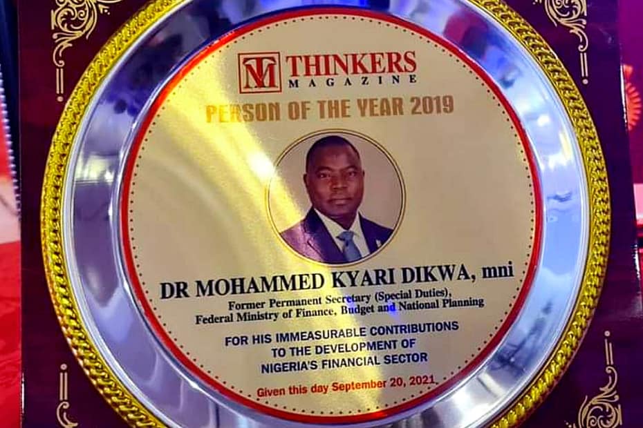Thinkers Magazine Person of The Year 2019 Award given to Dr. Mohammed Kyari Dikwa mni, for his Immeasurable Contributions to the Development of Nigeria’s Financial Sector.