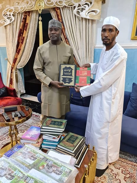 The Founder and President of Al-Ansar Foundation Dr. M.K Dikwa mni received copies of some books donated to the Al-Ansar Masjid Islamic Library and as well some copies of table calendar containing some mind-blowing Humanitarian activities of Al-Ansar Foundation donated by the the Chief Imam of Al-Ansar Masjid Maiduguri Imam Goni Umar Goni Usman immediately after coming back from his trip to Sudan in Abuja. The Chief Imam went ahead and presented his donations of the books he brought from Sudan.